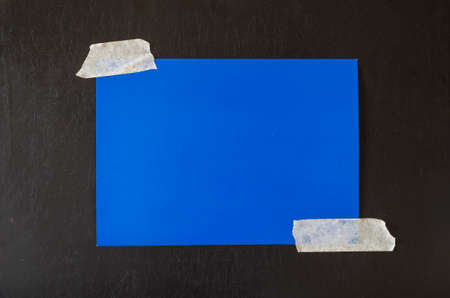 Rectangular sheet of blue paper glued with adhesive tape to a black background. Minimalistic multitask background.