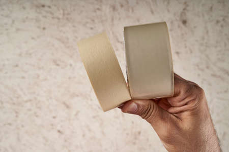 man's hand holding different types of adhesive tapes