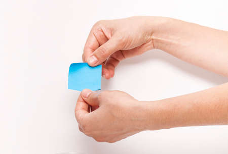 Hand holding sticky post note paper sheet on white background