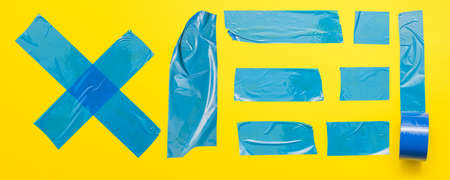 Photo Blue tape on yellow background. High quality beautiful photo concept