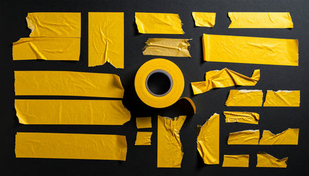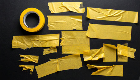 A roll of yellow adhesive tape and scattered torn pieces of tape are arranged on a dark flat lay surface.