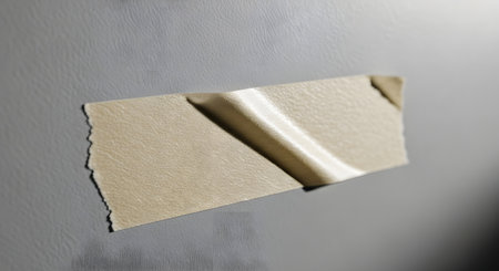 A single piece of beige tape is peeling away from a rough, textured gray background, showing its adhesive side.