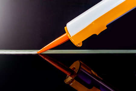 Closeup image of Applying silicone sealant by Caulking gun ,silicon adhesive at dark mirror glass table as for general and industrial application. Maintenance concept.