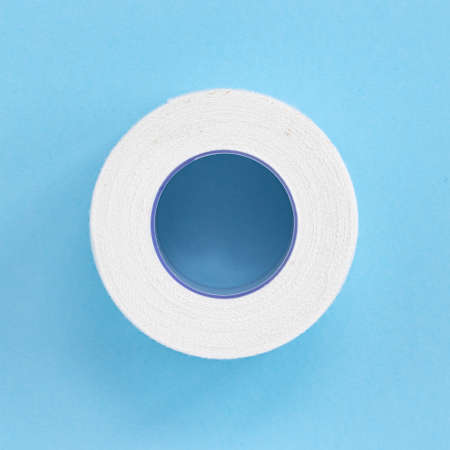 white roll band aid strip isolated on blue background, reel of adhesive bandage, top view