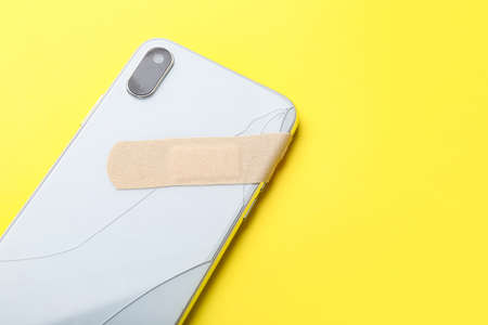 Broken mobile phone with medical plaster on yellow background, closeup