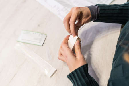 In the previous preparations. A young woman doing the rapid antigen test at her home, sars-cov-2 tests. Security measures in the coronavirus pandemic
