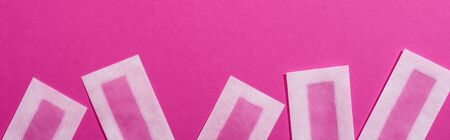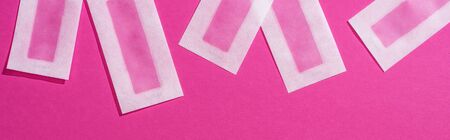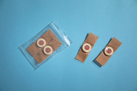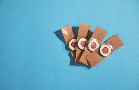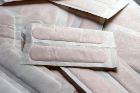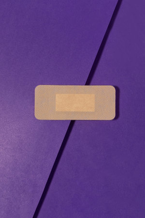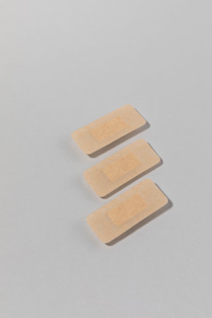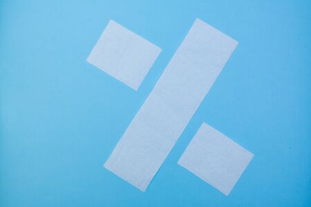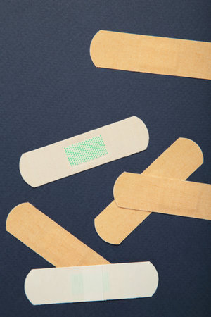 Medical sticking plasters on dark blue background. First aid item. Vertical photo