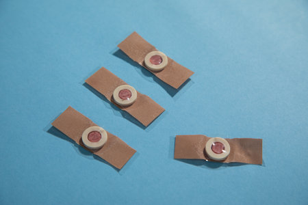 A closeup of a skin patch with microchip technology embedded positioned on a persons wrist showcasing innovative wearable tech that tracks health metrics in realtime..