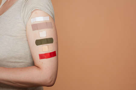 Closeup on middle aged woman with patches on hand symbolizing many vaccines done isolated on beige.