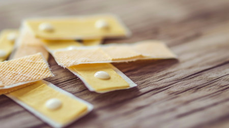different types and sizes of medical band-AIDS lie together on a wooden surface, close-up