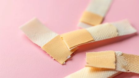 A variety of yellow and beige tape pieces and a roll of tape are arranged in a flat lay on a dark surface.