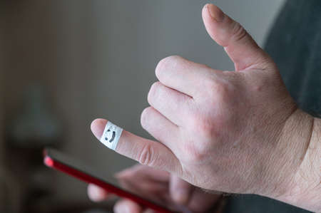 A man is scrolling through messages on his smartphone. A red smartphone is held in his hands. The first phalanx of his pinky finger is wrapped in white ribbon. A smiling face is painted on the bandage