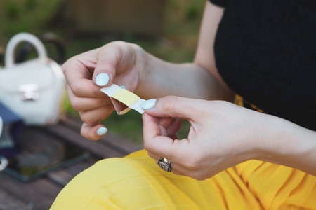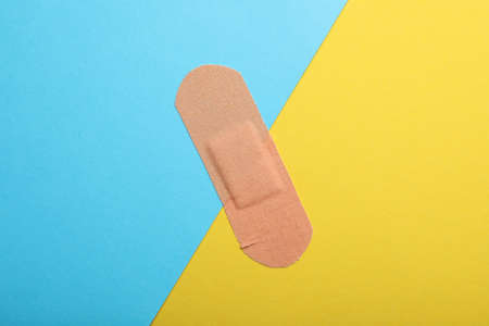 female hand and brown medical adhesive plaster for the treatment of injuries and cuts on the skin, blue background