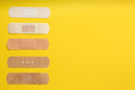 Different types of sticking plasters on yellow background, flat lay. Space for text