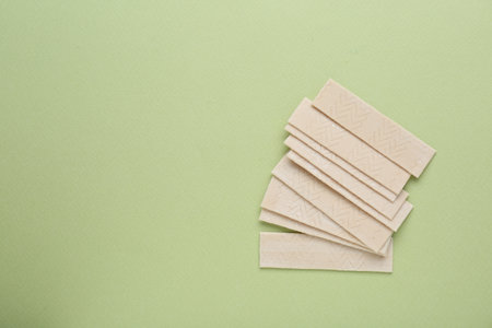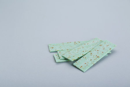 Many sticks of tasty chewing gum on light gray background. Space for text