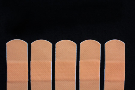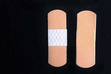Adhesive bandage against a black background. Medical adhesive bandage stock image. Image of medical plaster glued like a cross