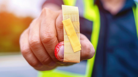 Closeup worker's cut thumb with adhesive bandage. Close up hand of professional construction technician or industrial factory workman in work uniform showing finger with medical bandage Injury concept