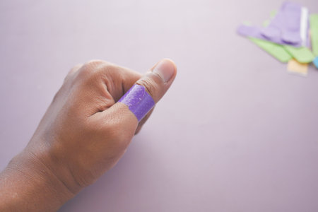 Man placing bandage or adhesive plaster on his thumb finger. plaster on the wound