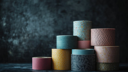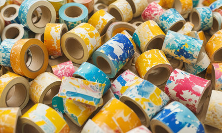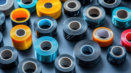 A collection of colorful decorative tapes arranged in a striking manner on a dark background, perfect for arts and crafts projects. Ideal for decorators and DIY enthusiasts.