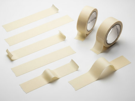Packaging showing pile of yellow masking tape pieces overlapping on a black surface keywords: yellow tape, masking...