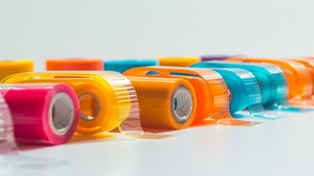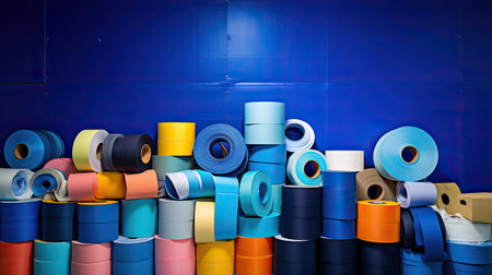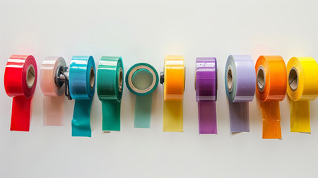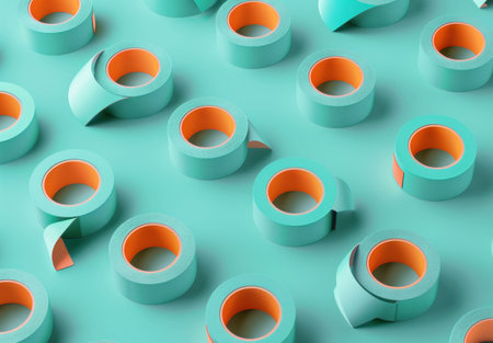 colorful adhesive tape rolls on a turquoise background, artistic flat lay image showcasing vibrant colors and geometric shapes for creative projects and DIY activities