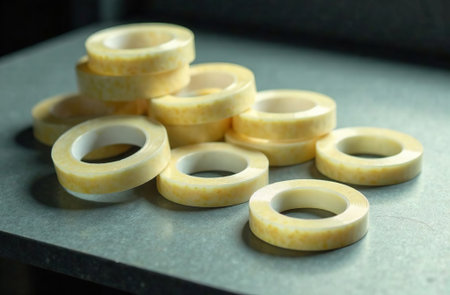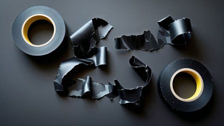 Two black insulating tape rolls and some torn pieces lying on a dark gray background, creating an abstract composition. Ai generated image