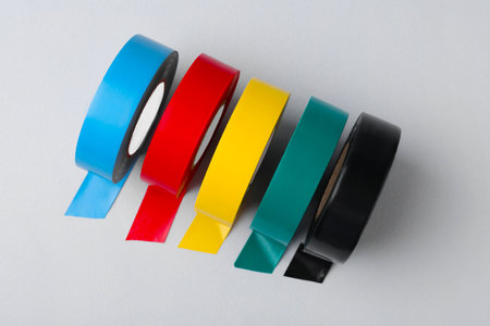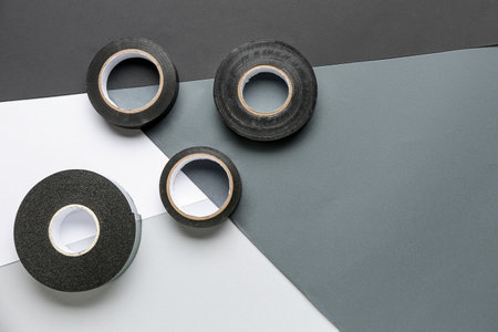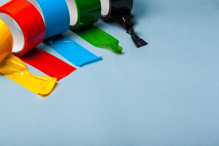 Construction colored adhesive tape, electrical insulating tape on a light background. Top view, flat lay. Banner.