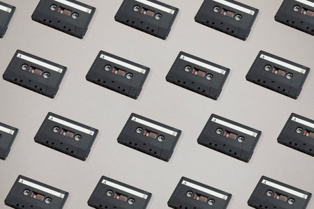 Pattern made of black audio cassette. Gray Background. Music concept. tape.