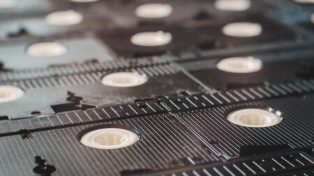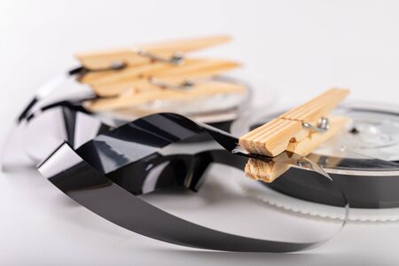 Tapes with a video recording are fastened with a washing clamp. Connecting and repairing old analog recordings. Light background.