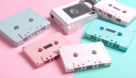 Pastel-colored audio cassettes arranged on a pink and teal background, showcasing a variety of designs and angles