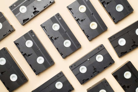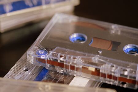 Old audio cassettes with retro music. View from above. Music media from previous years.