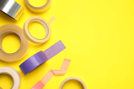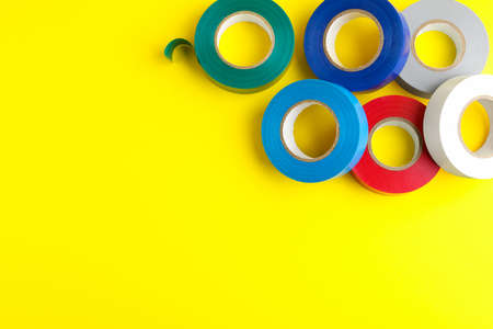 Colorful insulating tapes on yellow background, flat lay. Space for text