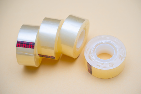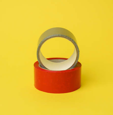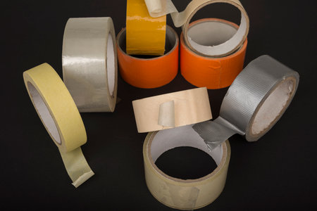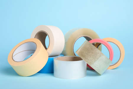 Several rollers of adhesive tape for different purposes. Paint and duct tape. Selective focus.