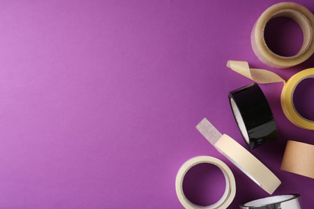 Rolls of different adhesive tapes on purple background, flat lay. Space for text