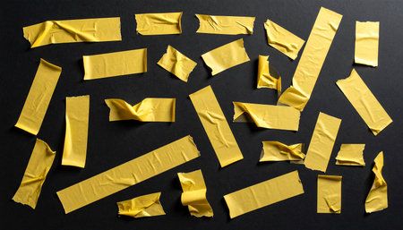 A collection of yellow masking tape pieces in different sizes and shapes on a dark surface.