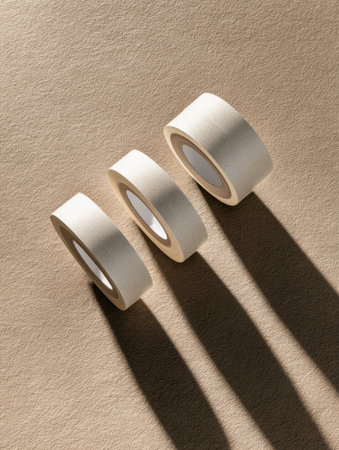 Three beige adhesive tapes rest neatly on a rough surface, their elongated shadows stretching in the sunlight against a simple, subdued backdrop.