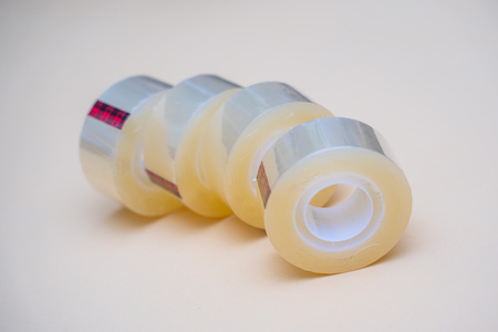Macro shot of a roll of tape standing vertically on a light tabletop, emphasizing circular form