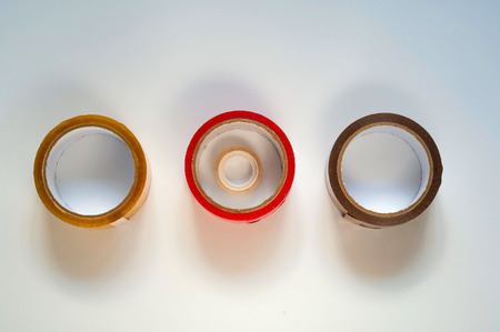 colored scotch tape, Accessories for packaging on white background,copy space, closeup, flat lay,