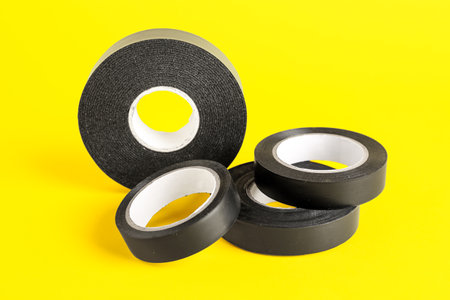 Rolls of adhesive tape wrapped in yellow tape on a white background