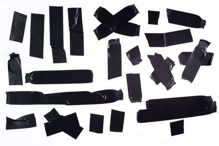 Torn off pieces of black insulating tape on white isolated, different shapes of pieces of tape, high resolution.