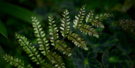 Beautiful vivid leaves on black branches of adiantum fern