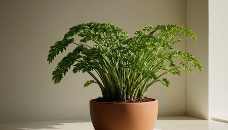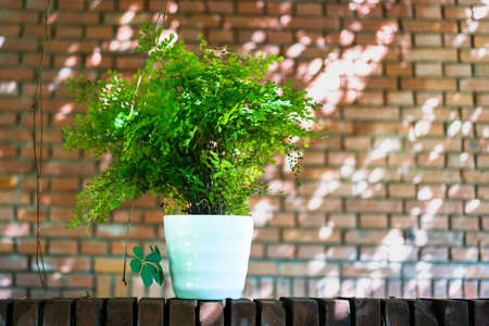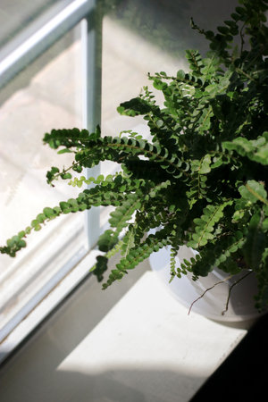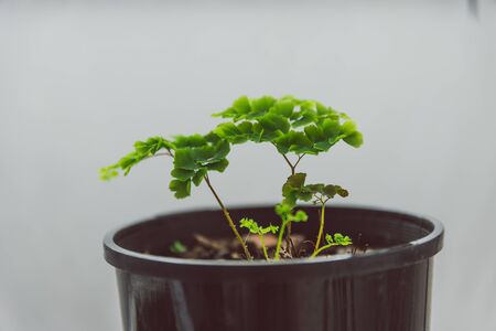 concept of growing plants indoor, small green healthy maidenhair fern in indoor setting in a greenhouse