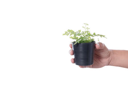 Hand holding small plant pot of Cyathea Dealbata or silver fern on white background