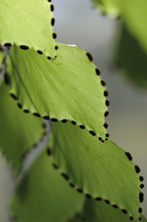 Peruvian maidenhair leaf close up in the garden with selective focus on te spores