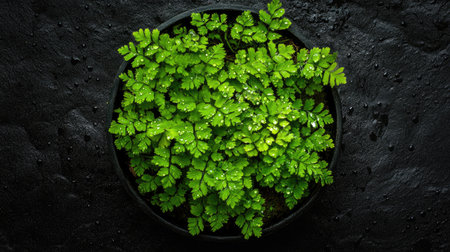 A vibrant green fern thriving in a black pot against a dark background, showcasing the intricate texture of its leaves and the beauty of nature indoors.
