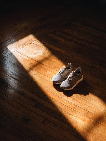A pair of gray sneakers is placed on a rustic wooden floor, illuminated by soft, warm light filtering through a nearby window during midday.