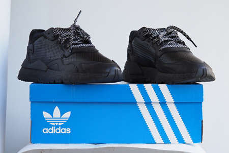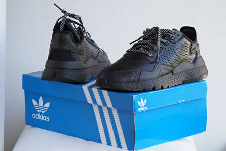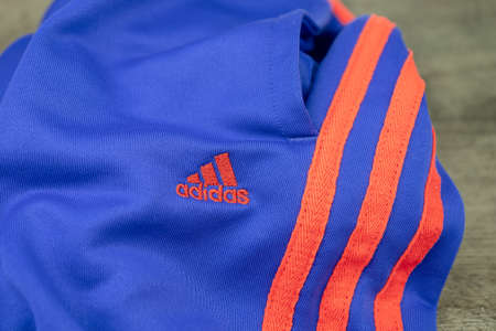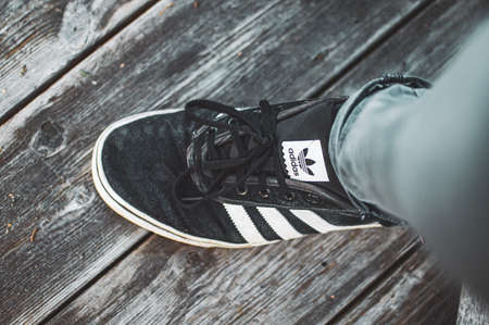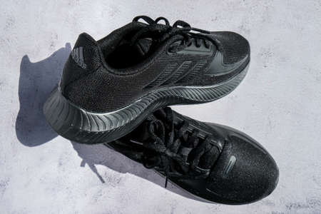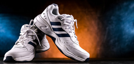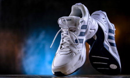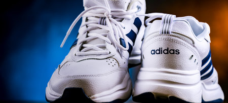 POZNAN, POL - OCT 13, 2022: A pair of Adidas sport shoes, the brand of the largest sportswear manufacturer in Europe and the second biggest in the world