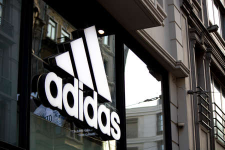 Istanbul, Turkey - October-27.2019: Adidas advertisement sign on Istiklal street close up. Photo from the cross.