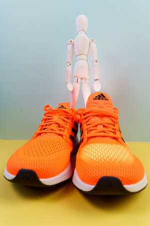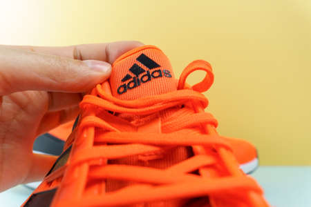 Tyumen, Russia-January 13, 2022: Adidas logo on orange running shoes. Vertical photo