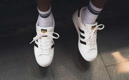 Bangkok, Thailand - May 20, 2019: a closeup of white Adidas Superstar sneakers on men's feet.